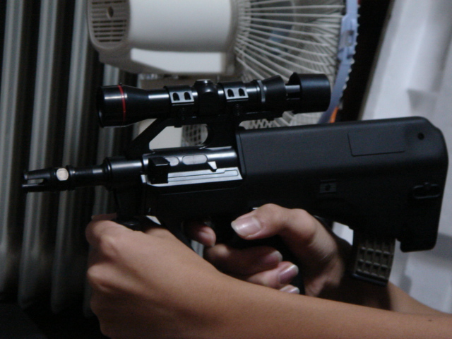 スコープがマガジンとなっていて、スコープ機能はありませんが、スコープ上部の突起で狙いを付けることが出来ます